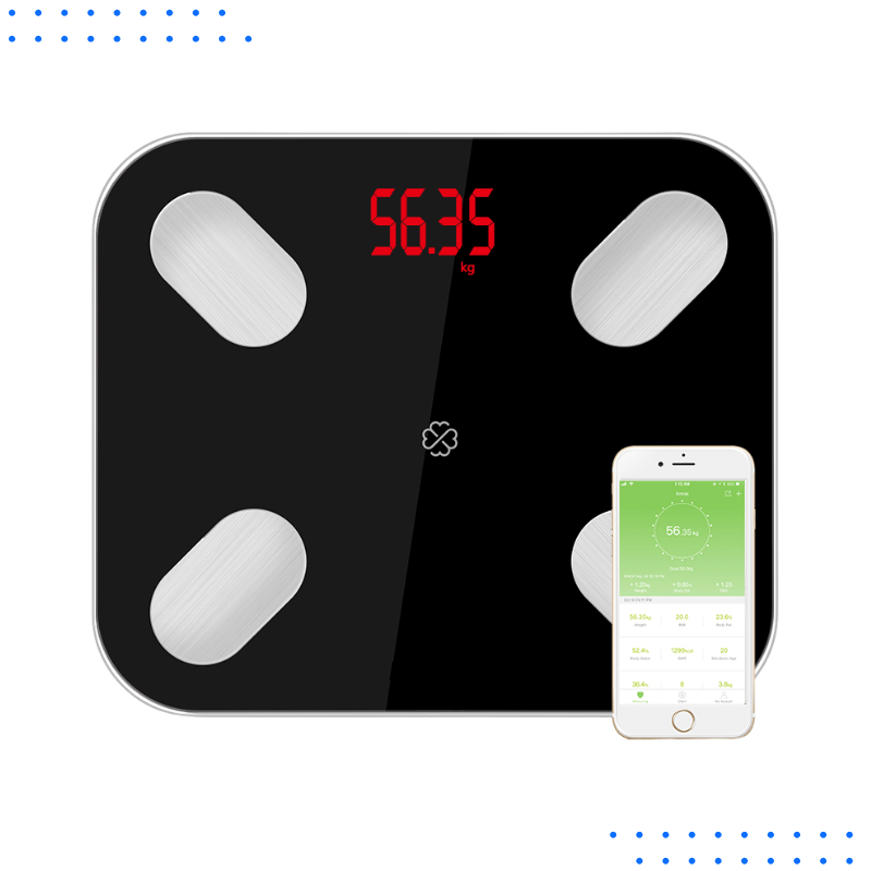 Smart scale for tracking weight, BMI, and full body composition. Syncs with your smartphone to monitor health data, ideal for home fitness and family use.